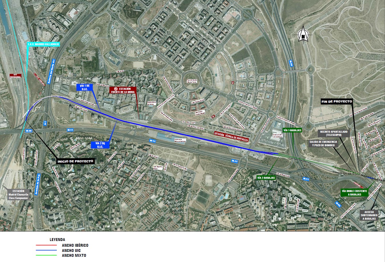 Enlace en alta velocidad con Barajas El enlace en alta velocidad con Barajas aprovecha una parte de la línea actual de Cercanías, el tramo entre el túnel de acceso al aeropuerto y la T-4, que discurre en vía mixta o de tres hilos, apta tanto para trenes convencionales como de alta velocidad. Para completarlo, se construyen 3,5 km de línea de ancho estándar entre la cabecera norte de Chamartín y el túnel de acceso al aeropuerto.